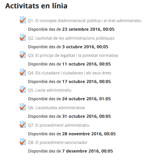 A la interfície del curs els qüestionaris apareixen com enllaços i poden anar acompanyats o no d'informacions sobre el període d'obertura o les condicions d'accés: