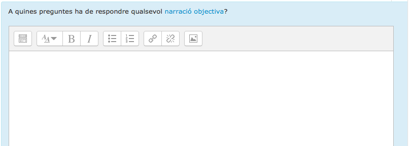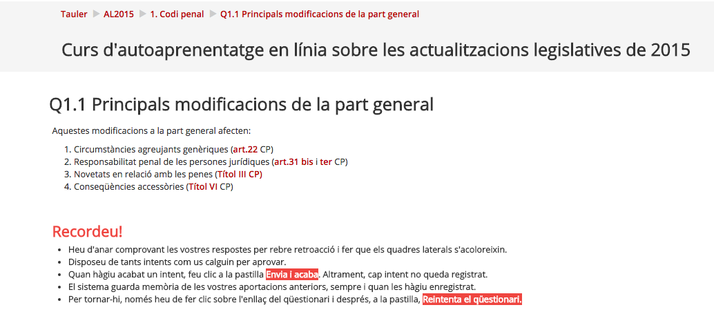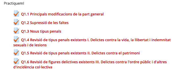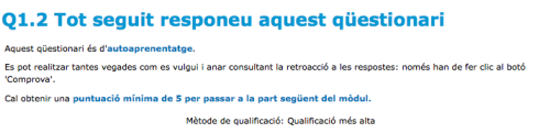 Aquestes eines valoraran automàticament els vostres coneixements i us permetran tenir una petita idea de l'assoliment d'objectius del curs i saber si cal repassar alguna part de contingut que no us hagi quedat del tot clara o bé rellegir tot el tema.
