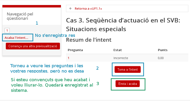 - Si feu clic a la pastilla 1, abandoneu l'intent i no queda enregistrada cap dada ni consta com a lliurat el qüestionari.