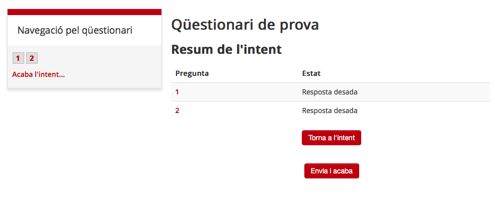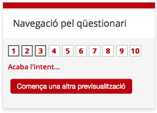 - Si opta per l'opció 2, podrà revisar les seves respostes abans de lliurar definitivament el qüestionari, sempre i quan el qüestionari no estigui configurat expressament perquè no ho pugueu fet. Penseu sempre que cada qüestionari té la seva programació específica. Cal que estigueu atent a les indicacions que se us dona a l'inici.