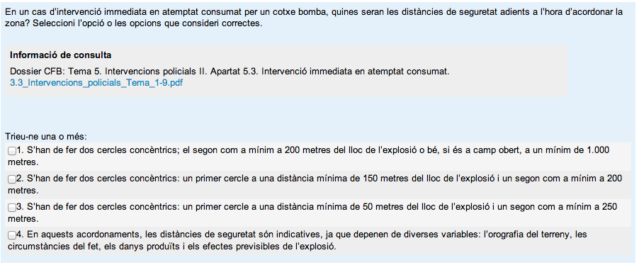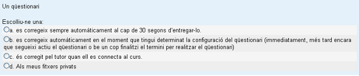 - Opcions múltiples: la mateixa pregunta dóna UNA o diferents respostes alternatives a una qüestió o disjuntiva. Per tal d'encertar la resposta, cal marcar-ne