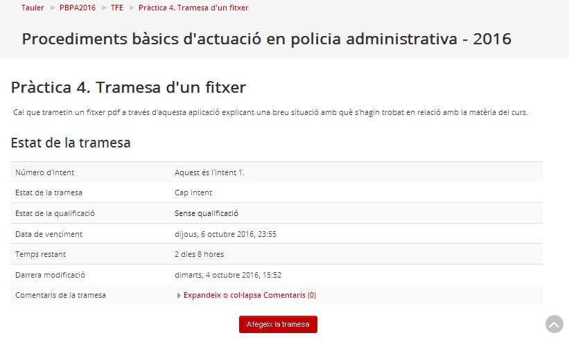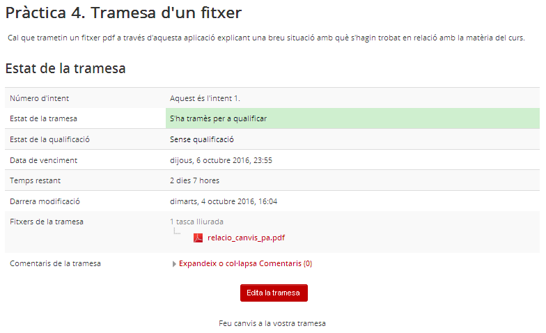 Fixeu-vos que, si la configuració ho permet, disposeu d'una pastilla per si voleu modificar la vostra tasca abans no venci el termini de presentació, Edita la tramesa. Aquesta és una opció que no sempre està disponible: com en d'altres casos dependrà de la configuració.