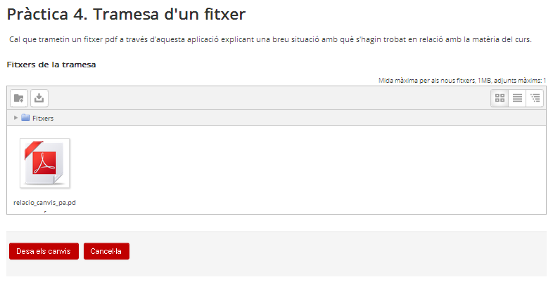 - La tasca pot estar configurada per editar en línia o bé per trametre un fitxer. Si heu d'editar en línia us apareix un quadre d'edició perquè hi escrigueu. Hi escriviu i quan hàgiu acabat, feu clic a la pastilla Desa els canvis. En cas que hàgiu de fer tramesa de fitxer, només caldrà que el tingueu preparat al vostre dispositiu i l'arrossegueu fins al requadre de càrrega o bé l'incorporeu fent clic a la icona ressaltada en vermell
