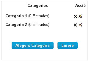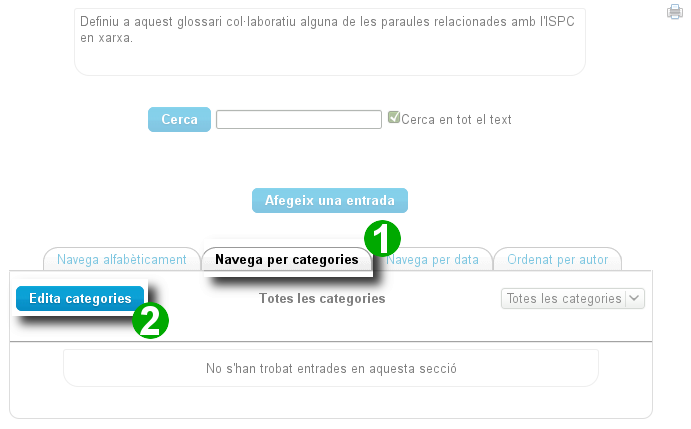- Abans de crear una entrada, val la pena crear les categories de termes accedint a la pestanya Navega per categories i fent clic sobre el botó Edita categories.