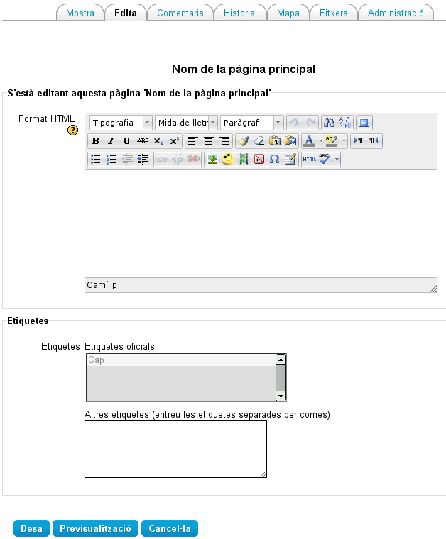 Així mateix, es pot configurar quin serà l'editor que s'utilitzarà per editar les pàgines de wiki, en el nostre cas, fem servir l'HTML on s'hi pot inserir contingut, imatges, enllaços etc, però es podrien fer servir el Creole i Nwiki.