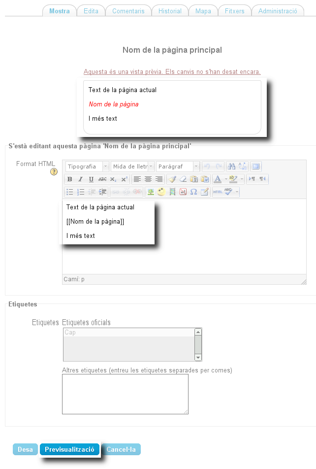 - Afegiu text a la pàgina i feu servir l'editor HTML per donar-li format i, si cal, imatges. Si voleu crear una pàgina nova dins de la wiki, escriviu el seu nom entre claudàtors dobles (per exemple [[Nom de la pàgina]]). Si cliqueu sobre el botó Previsualització, veureu que el text de la pàgina nova apareix en cursiva de color vermell: