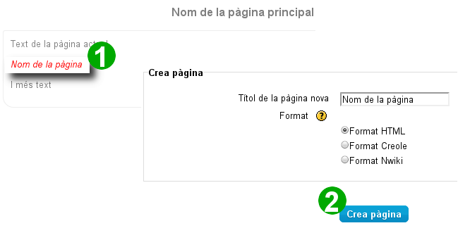 A Moodle és molt senzill d'editar una wiki, perquè incorpora diversos tipus d'editors (en el nostre cas fem servir per defecte l'HTML) i la creació de pàgines noves dins la wiki és automàtica: només cal escriure el Nom De La Pàgina entre claudàtors dobles (**[[Nom De La Pàgina]]**) per tenir una pàgina nova anomenada NomDeLaPàgina.