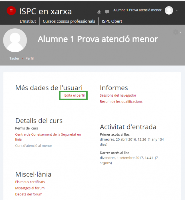 Les dades que apareixen al vostre perfil per defecte són dades bàsiques que heu proporcionat als responsables de formació de l'ISPC. Ara bé, us pot interessar poder modificar aquesta informació o bé afegir-ne de nova. Si modifiqueu el correu electrònic us demanem que també comuniqueu aquest canvi als responsables de formació de l'ISPC per què les vostres dades siguin coherents amb el registre acadèmic de l'ISPC.