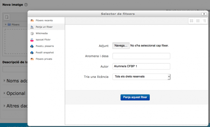 - Un cop hàgiu fet clic a la pastilla Penja aquest fitxer, el fitxer de la imatge que hàgiu carregat us apareixerà a la franja blava. Empleneu la casella Descripció, per exemple amb el vostre nom de pila.