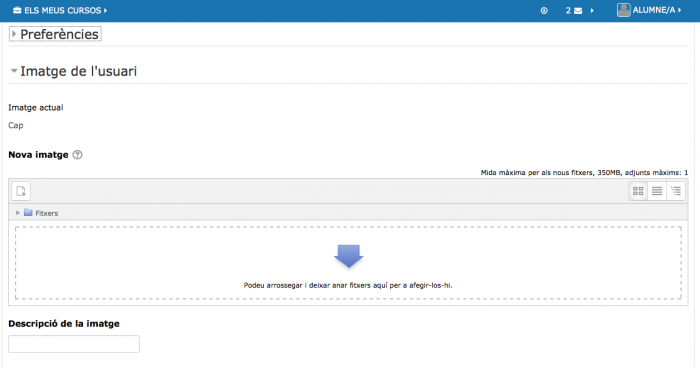 Consell: L'apartat Descripció permet introduir una breu descripció o informació de vosaltres mateixos que vulgueu fer pública a la resta de companys. És com la vostra targeta de presentació. - A l'apartat Imatge de l'usuari, heu d'introduir-hi la vostra fotografia; com a professors és important que l'alumnat us pugui identificar amb claredat. Recomanem que la imatge no faci més de 200 kilobits!